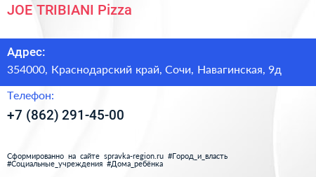 JOE TRIBIANI Pizza по адресу 354000, Краснодарский край, Сочи, Навагинская, 9д в дальнейшем Организация, размещена в следующих категориях: