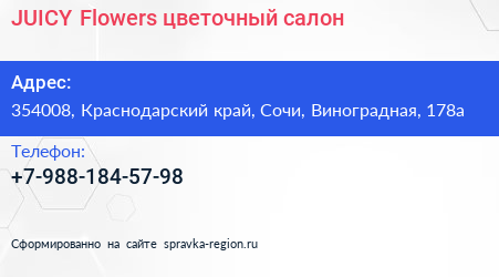 JUICY Flowers, цветочный салон по адресу 354008, Краснодарский край, Сочи, Виноградная, 178а в дальнейшем Организация, размещена в следующих категориях: