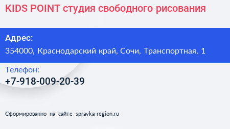 KIDS POINT, студия свободного рисования по адресу 354000, Краснодарский край, Сочи, Транспортная, 1 в дальнейшем Организация, размещена в следующих категориях: