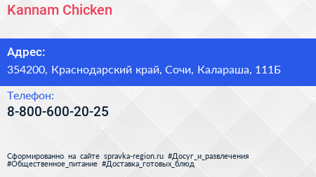 Kannam Chicken по адресу 354200, Краснодарский край, Сочи, Калараша, 111Б в дальнейшем Организация, размещена в следующих категориях: