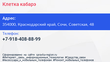Клетка, кабарэ по адресу 354000, Краснодарский край, Сочи, Советская, 48 в дальнейшем Организация, размещена в следующих категориях: