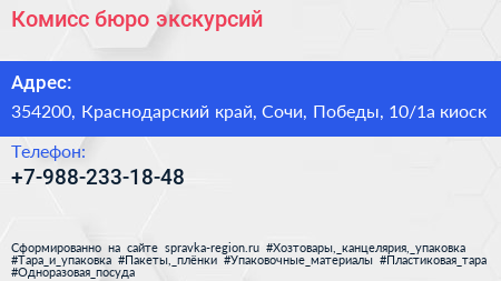 Комисс, бюро экскурсий по адресу 354200, Краснодарский край, Сочи, Победы, 10/1а киоск в дальнейшем Организация, размещена в следующих категориях: