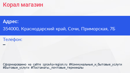 Корал, магазин по адресу 354000, Краснодарский край, Сочи, Приморская, 7Б в дальнейшем Организация, размещена в следующих категориях: