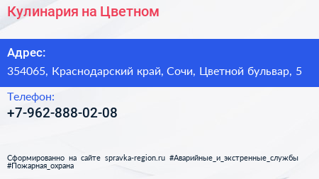 Кулинария на Цветном по адресу 354065, Краснодарский край, Сочи, Цветной бульвар, 5 в дальнейшем Организация, размещена в следующих категориях: