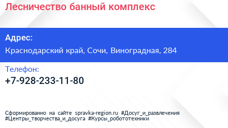 Лесничество, банный комплекс по адресу Краснодарский край, Сочи, Виноградная, 284 в дальнейшем Организация, размещена в следующих категориях: