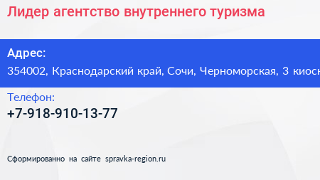 Лидер, агентство внутреннего туризма по адресу 354002, Краснодарский край, Сочи, Черноморская, 3 киоск в дальнейшем Организация, размещена в следующих категориях: