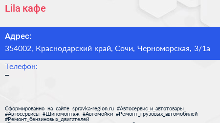 Lila, кафе по адресу 354002, Краснодарский край, Сочи, Черноморская, 3/1а в дальнейшем Организация, размещена в следующих категориях:
