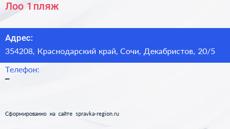 Лоо 1, пляж по адресу 354208, Краснодарский край, Сочи, Декабристов, 20/5 в дальнейшем Организация, размещена в следующих категориях: