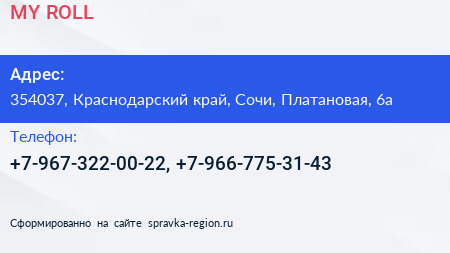 MY ROLL по адресу 354037, Краснодарский край, Сочи, Платановая, 6а в дальнейшем Организация, размещена в следующих категориях: