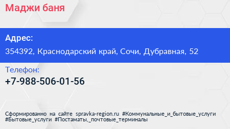Маджи, баня по адресу 354392, Краснодарский край, Сочи, Дубравная, 52 в дальнейшем Организация, размещена в следующих категориях: