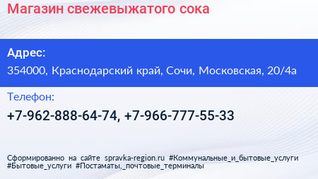 Магазин свежевыжатого сока по адресу 354000, Краснодарский край, Сочи, Московская, 20/4а в дальнейшем Организация, размещена в следующих категориях: