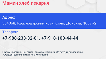Мамин хлеб, пекарня по адресу 354068, Краснодарский край, Сочи, Донская, 108а к2 в дальнейшем Организация, размещена в следующих категориях: