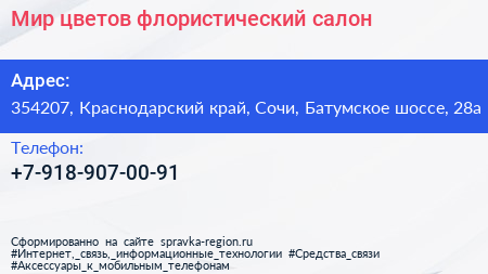 Мир цветов, флористический салон по адресу 354207, Краснодарский край, Сочи, Батумское шоссе, 28а в дальнейшем Организация, размещена в следующих категориях: