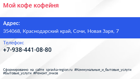 Мой кофе, кофейня по адресу 354068, Краснодарский край, Сочи, Новая Заря, 7 в дальнейшем Организация, размещена в следующих категориях: