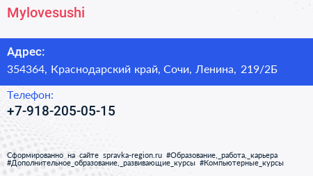 Mylovesushi по адресу 354364, Краснодарский край, Сочи, Ленина, 219/2Б в дальнейшем Организация, размещена в следующих категориях: