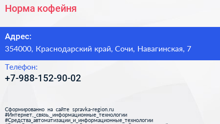 Норма, кофейня по адресу 354000, Краснодарский край, Сочи, Навагинская, 7 в дальнейшем Организация, размещена в следующих категориях: