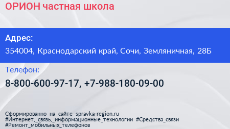 ОРИОН, частная школа по адресу 354004, Краснодарский край, Сочи, Земляничная, 28Б в дальнейшем Организация, размещена в следующих категориях:
