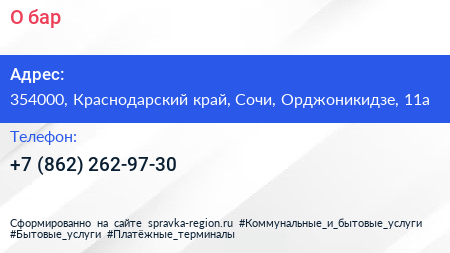 О`бар по адресу 354000, Краснодарский край, Сочи, Орджоникидзе, 11а в дальнейшем Организация, размещена в следующих категориях:
