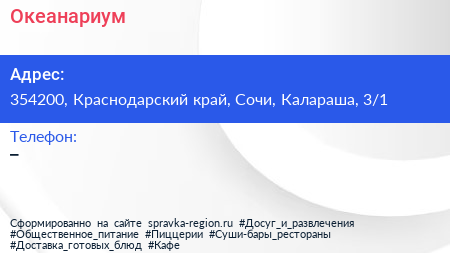 Океанариум по адресу 354200, Краснодарский край, Сочи, Калараша, 3/1 в дальнейшем Организация, размещена в следующих категориях: