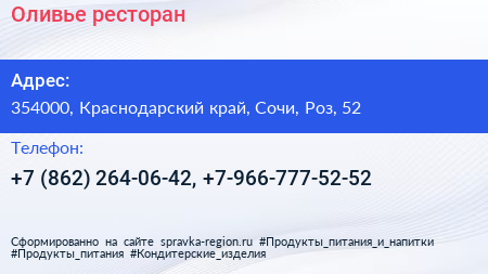 Оливье, ресторан по адресу 354000, Краснодарский край, Сочи, Роз, 52 в дальнейшем Организация, размещена в следующих категориях:
