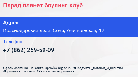 Парад планет, боулинг-клуб по адресу Краснодарский край, Сочи, Ачипсинская, 12 в дальнейшем Организация, размещена в следующих категориях: