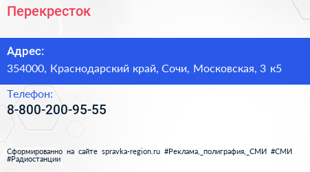 Перекресток по адресу 354000, Краснодарский край, Сочи, Московская, 3 к5 в дальнейшем Организация, размещена в следующих категориях: