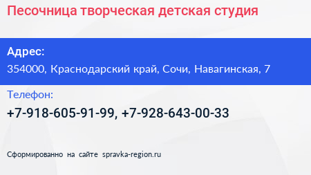 Песочница, творческая детская студия по адресу 354000, Краснодарский край, Сочи, Навагинская, 7 в дальнейшем Организация, размещена в следующих категориях: