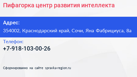 Пифагорка, центр развития интеллекта по адресу 354002, Краснодарский край, Сочи, Яна Фабрициуса, 8а в дальнейшем Организация, размещена в следующих категориях: