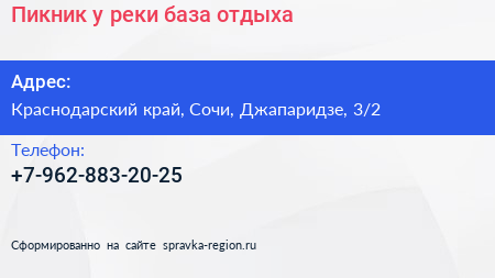 Пикник у реки, база отдыха по адресу Краснодарский край, Сочи, Джапаридзе, 3/2 в дальнейшем Организация, размещена в следующих категориях: