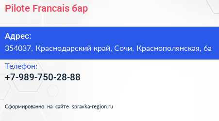 Pilote Francais, бар по адресу 354037, Краснодарский край, Сочи, Краснополянская, 6а в дальнейшем Организация, размещена в следующих категориях:
