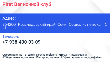 Pirat Bar, ночной клуб по адресу 354200, Краснодарский край, Сочи, Социалистическая, 1 к1 в дальнейшем Организация, размещена в следующих категориях: