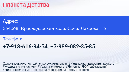 Планета Детства по адресу 354068, Краснодарский край, Сочи, Лавровая, 5 в дальнейшем Организация, размещена в следующих категориях: