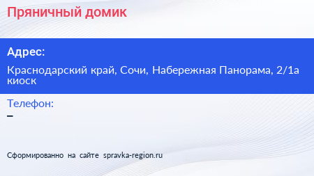 Пряничный домик по адресу Краснодарский край, Сочи, Набережная Панорама, 2/1а киоск в дальнейшем Организация, размещена в следующих категориях: