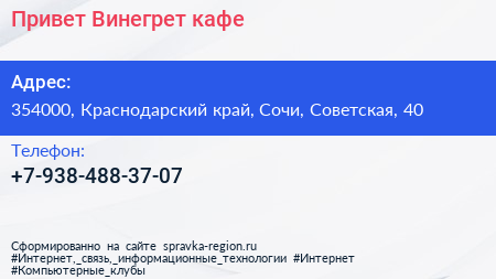 Привет, Винегрет!, кафе по адресу 354000, Краснодарский край, Сочи, Советская, 40 в дальнейшем Организация, размещена в следующих категориях: