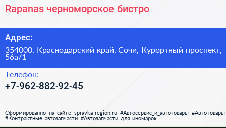 Rapanas, черноморское бистро по адресу 354000, Краснодарский край, Сочи, Курортный проспект, 56а/1 в дальнейшем Организация, размещена в следующих категориях: