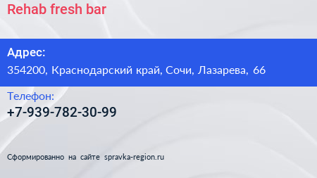 Rehab fresh bar по адресу 354200, Краснодарский край, Сочи, Лазарева, 66 в дальнейшем Организация, размещена в следующих категориях: