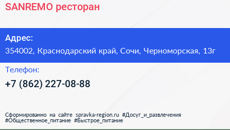 SANREMO, ресторан по адресу 354002, Краснодарский край, Сочи, Черноморская, 13г в дальнейшем Организация, размещена в следующих категориях: