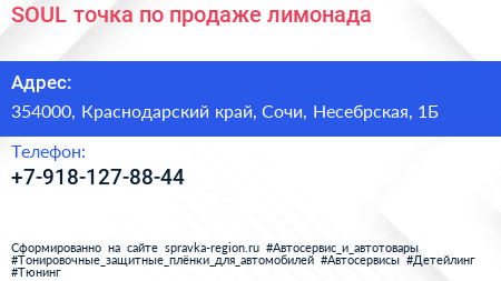 SOUL, точка по продаже лимонада по адресу 354000, Краснодарский край, Сочи, Несебрская, 1Б в дальнейшем Организация, размещена в следующих категориях: