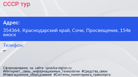 СССР-тур по адресу 354364, Краснодарский край, Сочи, Просвещения, 154в киоск в дальнейшем Организация, размещена в следующих категориях: