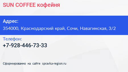 SUN COFFEE, кофейня по адресу 354000, Краснодарский край, Сочи, Навагинская, 3/2 в дальнейшем Организация, размещена в следующих категориях: