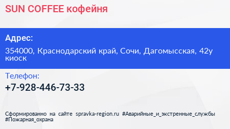 SUN COFFEE, кофейня по адресу 354000, Краснодарский край, Сочи, Дагомысская, 42у киоск в дальнейшем Организация, размещена в следующих категориях:
