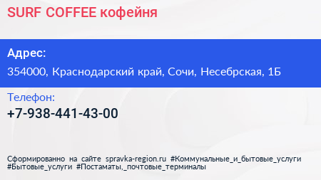 SURF COFFEE, кофейня по адресу 354000, Краснодарский край, Сочи, Несебрская, 1Б в дальнейшем Организация, размещена в следующих категориях: