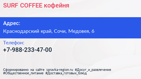 SURF COFFEE, кофейня по адресу Краснодарский край, Сочи, Медовея, 6 в дальнейшем Организация, размещена в следующих категориях:
