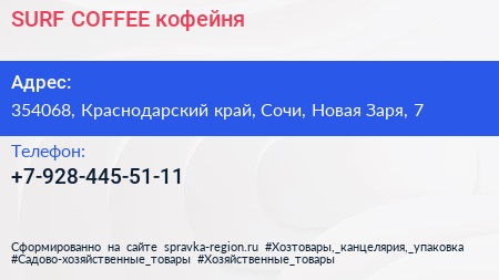 SURF COFFEE, кофейня по адресу 354068, Краснодарский край, Сочи, Новая Заря, 7 в дальнейшем Организация, размещена в следующих категориях: