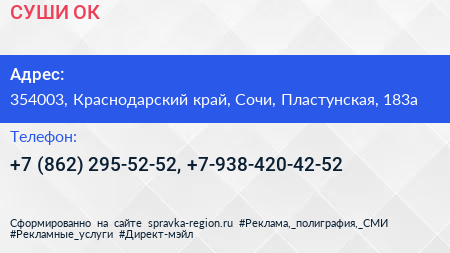 СУШИ ОК+ по адресу 354003, Краснодарский край, Сочи, Пластунская, 183а в дальнейшем Организация, размещена в следующих категориях: