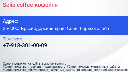 Seliu coffee, кофейня по адресу 354000, Краснодарский край, Сочи, Горького, 56а в дальнейшем Организация, размещена в следующих категориях: