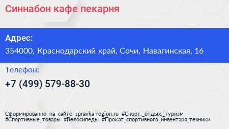 Синнабон, кафе-пекарня по адресу 354000, Краснодарский край, Сочи, Навагинская, 16 в дальнейшем Организация, размещена в следующих категориях: