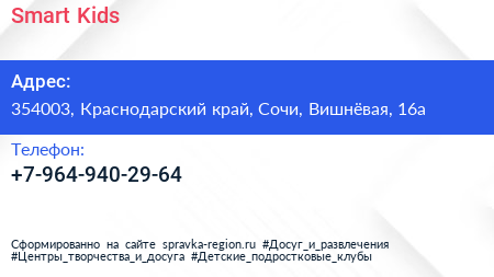 Smart Kids по адресу 354003, Краснодарский край, Сочи, Вишнёвая, 16а в дальнейшем Организация, размещена в следующих категориях: