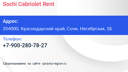 Sochi Cabriolet Rent по адресу 354000, Краснодарский край, Сочи, Несебрская, 1Б в дальнейшем Организация, размещена в следующих категориях: