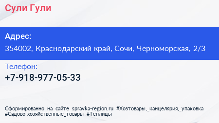 Сули & Гули по адресу 354002, Краснодарский край, Сочи, Черноморская, 2/3 в дальнейшем Организация, размещена в следующих категориях:
